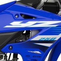 Race-inspired styling "from the sharp embedded graphics, to the aggressive bodywork including front and rear fenders, blacked-out radiator shrouds and number plates, to the smaller details like fork guards, rear brake disc and caliper protectors, and wide foot pegs" spotlights the YZ250's extensive two-stroke racing pedigree from every angle.